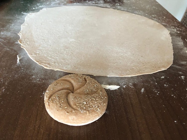 - Auf einer bemehlten Fläche den aufgeteilten Rohling vorsichtig ganz dünn ausrollen. Da er sich immer wieder ein bisserl zusammenzieht, braucht es ein bisserl Geduld