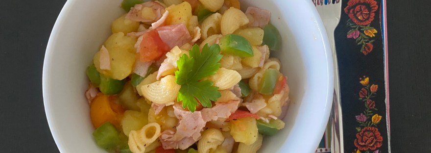 Ein hybrides Essen, wie wir es mögen: überbacken in einer gemeinsamen Form, wobei eine Hälfte vegetarisch zusammengestellt und die 2. Hälfte mit Schinken verfeinert wird. Das alles in einem Schritt ohne Mehraufwand. SO mögen wir das😊
